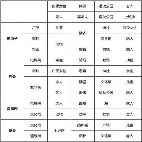 4、随后是体操、高尔夫、抓虫子、浴衣、露营、约会、骑马、忍者、猜谜、滑雪、音乐剧、西瓜、珍珠、宴会、捣年糕、相扑的