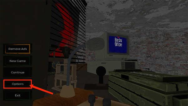 1、打开边境检察官最新版,进入游戏主界面,选择下方倒数第二个【Options】选择选项,