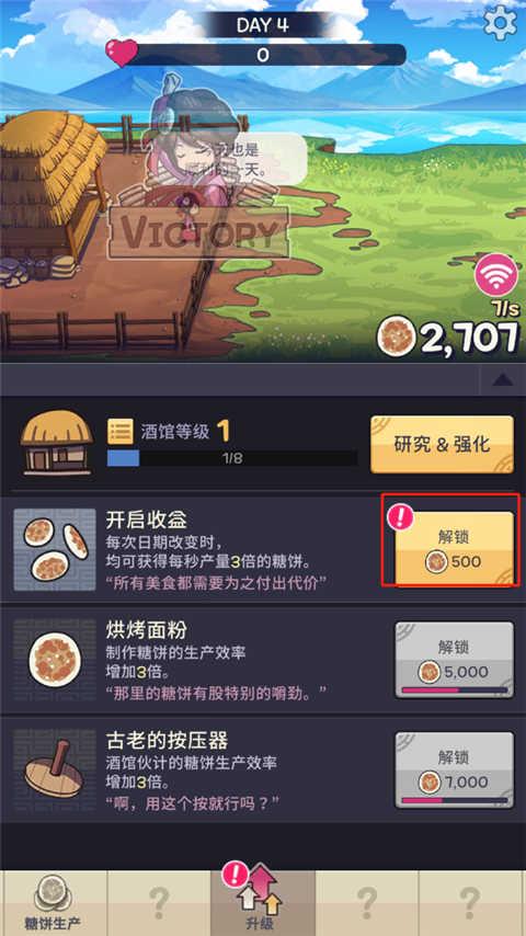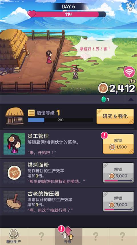 玩家点击屏幕下方升级,即可进行酒馆的升级,也可以用糖饼解锁更多内容。