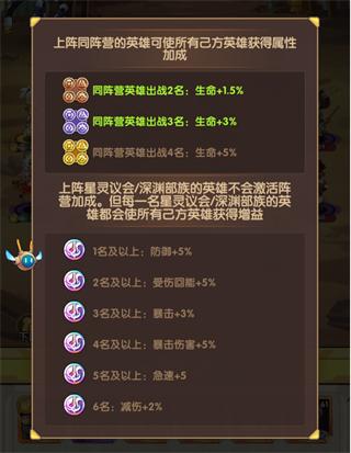 3、除此之外,需要了解阵容的加成效果有哪些。在游戏中我们区分为两类加成效果:属性加成和阵容加成。属性加成就是我们所说的聚能兽加成效果,而阵容加成顾名思义就是同阵容英雄出场的加成效果。