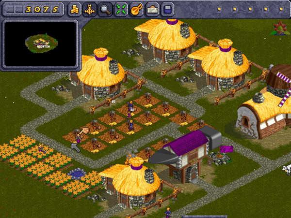 游戏的建筑控制菜单比较独特,玩家只要把鼠标移到画面左下方一横杠处,建筑物图标菜单就会“嗖”的一声弹出,以后还可左右移动鼠标选择更多的建筑物。游戏画面的上方有一排两组小图标,鼠标指向图标后便会弹出中文名称,中间一组是属于主菜单内容(关键是“财政”一项),右边一组是属于人物的功能控制(由于游戏中的人物都有一定自主性,对不少工作都会自动进行,所以这组按钮的作用不太明显)。