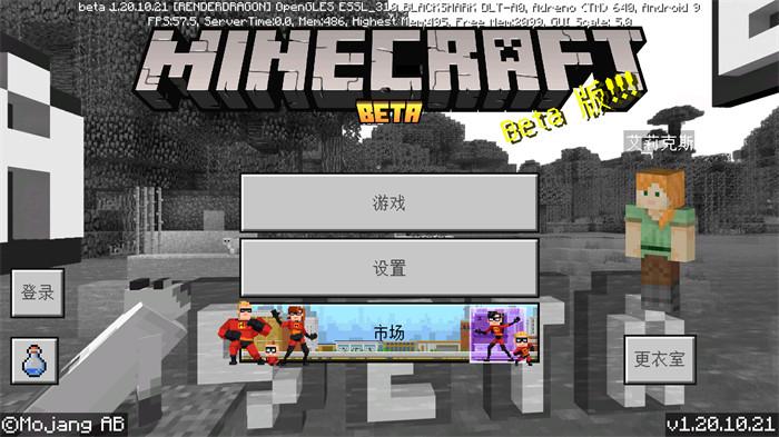 1、下载安装我的世界国际版手机安装包后,等待进入启动界面,在大厅可以看到游戏、设置、市场、登录、更衣室等主要按钮;