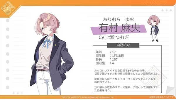 出生于海外的新入生。没有唱歌或舞蹈经验,总是畏畏缩缩的,没有自信的样子。虽然看起来没什么才能,但对偶像有着真挚的憧憬,是个非常努力的孩子。与挚友的清夏约定好要一起站上舞台。