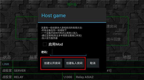 3、这里我们选择创建房间,就会有弹窗提示联机所需要的条件;