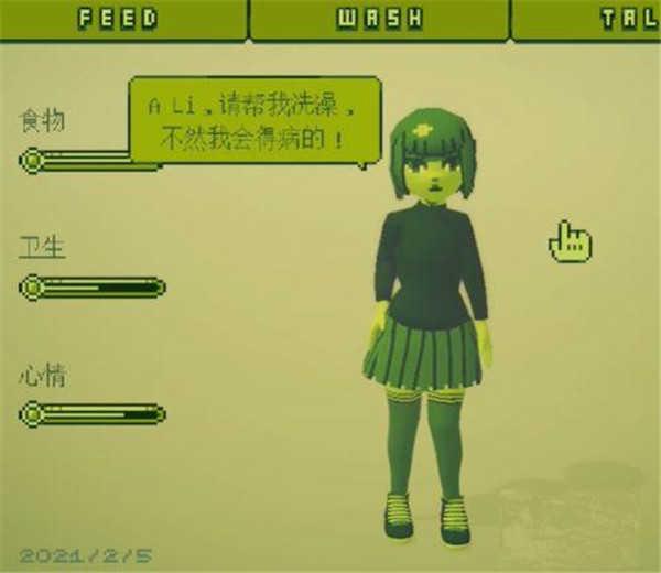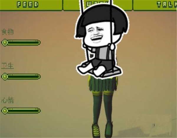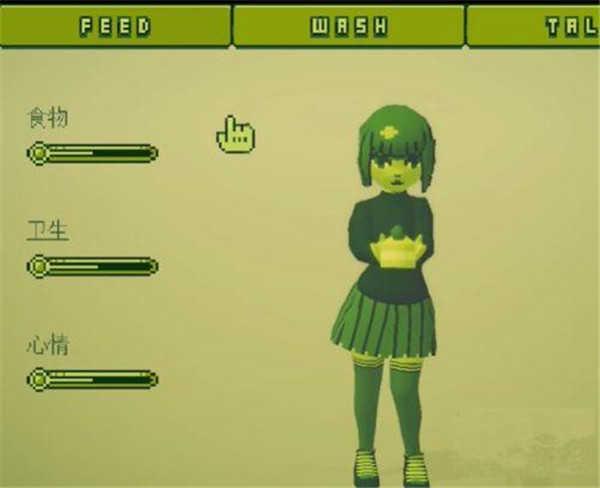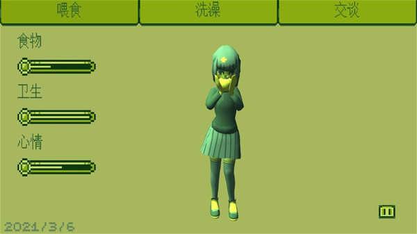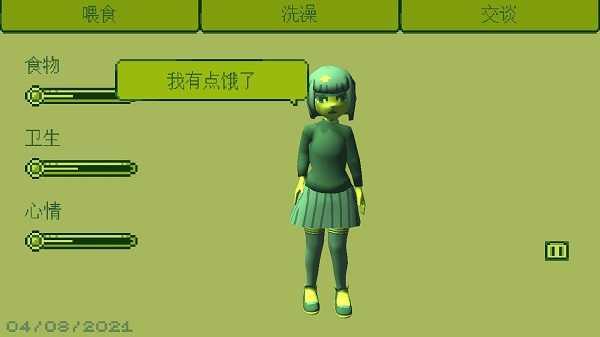 注意:女孩的左侧显示的食物、卫生、心情对应着不同的属性值,具体根据属性来选择喂食、洗澡,亦或者交谈!