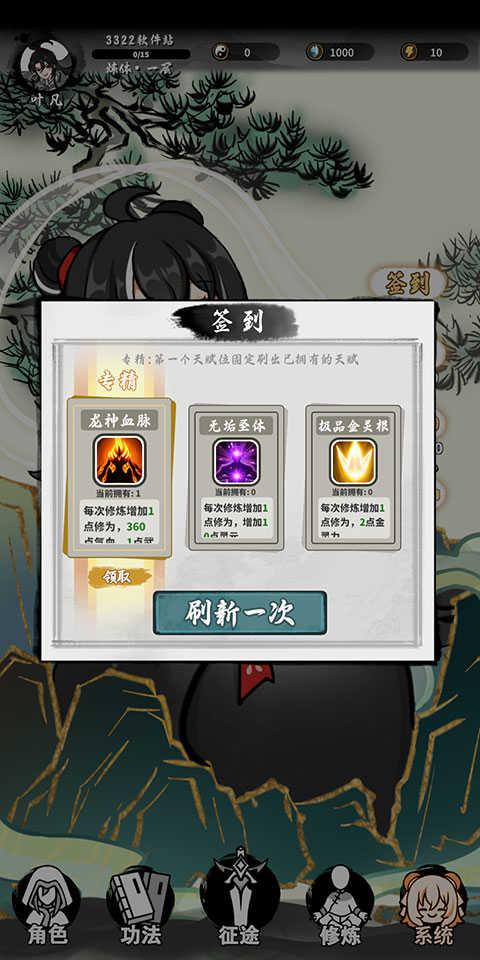 2、通过系统下的签到功能,可以让你获得强大的天赋,但需要消耗天命点,天命点可以通过闯关获得。