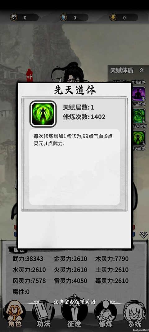 2、这边先天道体应该是目前加的属性最多的。之后,个人推荐的是血量和武力外带修为。前期不用一定无脑的升境界,可以看到体质修炼会加属性,所以完全可以贪几波好的然后连着体质属性一起吃,非常的爽。