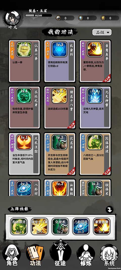 5、在功法界面,可以查看和配置你的功法。功法分为天地玄黄4级,最多上阵5个,重复获得可以提升功法等级。