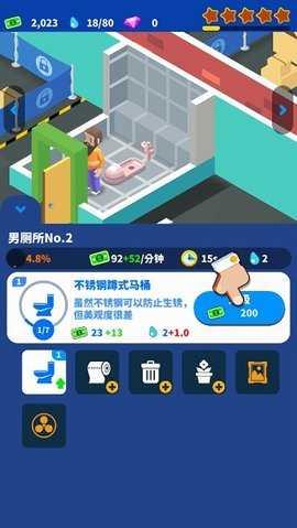 另外,在每间厕所中,玩家可通过增加各类基础设施,提升服务质量,比如客人没带纸,那么就增加卷纸功能,其他的还有各种装饰,壁画,抽风机等等。