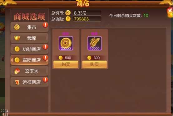 在军团商城中可消耗功勋购买铜钱或粮草,需注意的是商城中每日购买次数有限,且粮草和铜钱共享购买次数。升级军团即可提升购买次数上限。