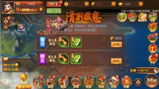 城池剿匪扫荡可快速获得经验值,不过每次获得的经验值很少,而且将消耗大量粮草,所以不作推荐。