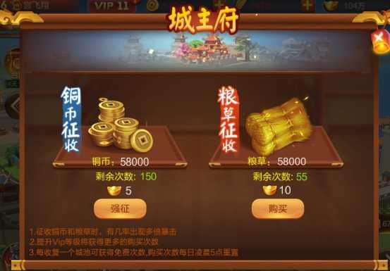 在征收中可征收铜钱与粮草,每成功收复一个城池,即可获得1次免费征收的次数,征收时还有一定几率使获得的资源翻2-3倍。免费征收次数耗尽之后,还可以消耗元宝进行征收。值得注意的是,游戏中会在固定的日期开放府库双倍活动,此时征收可获得双倍资源。