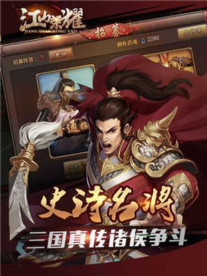 江山荣耀是一款策略国战手游,在这款游戏中以三国时期为游戏背景,玩家将成为一方诸侯,各种三国时期的历史人物真实还原,等你来招募,招兵买马,征战沙场,运用策略的头脑进行排兵布阵,丰富有趣的游戏玩法,感兴趣的朋友快来下载体验吧!