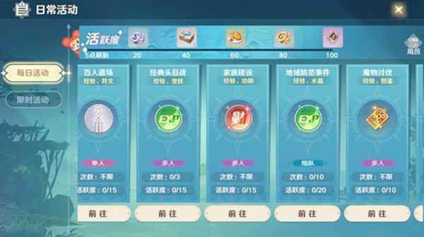 在日常活动中,有每日活动、限时活动、周常活动。随着等级的增加会有越来越多的任务去让你做,每个任务能获得的东西也不同,在这个页面都会有详细的说明,完成任务增加活跃度获取奖励。点击右上角的周历,可以看到每个活动的具体时间。