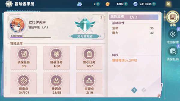 这里面包含了我上面说的地图挑战任务、爱心任务、探索点、传送点、资源点,这些跟着地图上的图标做就能完成。完成这些可以提升冒险者等级,可以额外获得属性加成、冒险特权加成、冒险者特权(提升活力上限,宠物封印概率),领取探索度奖励,完成爱心、挑战、悬赏、侦探任务都是可以获得冒险者经验,提升冒险者等级的。