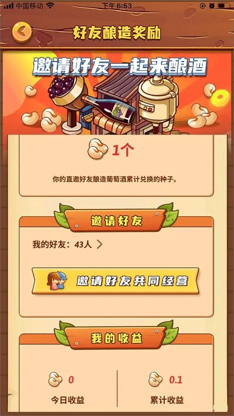 邀请的好友玩葡萄庄园会给上级反种子 10%的比例 。如下图 好友通过葡萄庄园获得了一个种子 可以给我反馈0.1个种子。我邀请的好友大部分人基本没玩 注册了玩一天就下线了 都没办法联系一起玩。