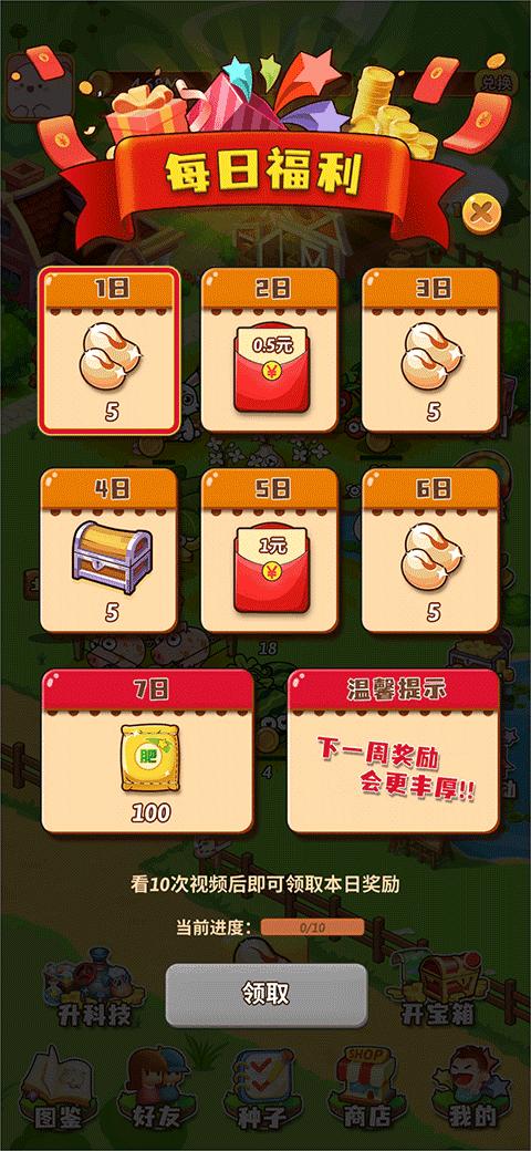 8、每天签到会得到现金奖励、种子、宝箱、化肥等;