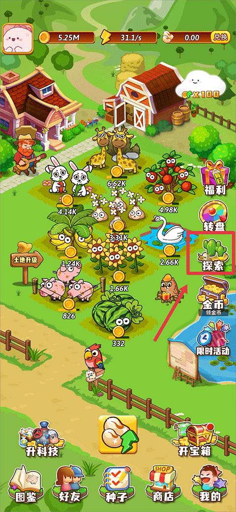 3、开宝箱可以得到作物图鉴、化肥、金币、种子等,探索可以得到藏宝图、图鉴、化肥、种子等;
