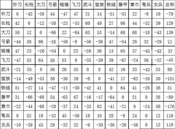 大体上,长兵器的克短兵器的,短兵器的克弓,弓克长兵器的.但也有特例,好比弩兵就克朴刀兵+8%,同种兵器之间相克程度不超过30%。
