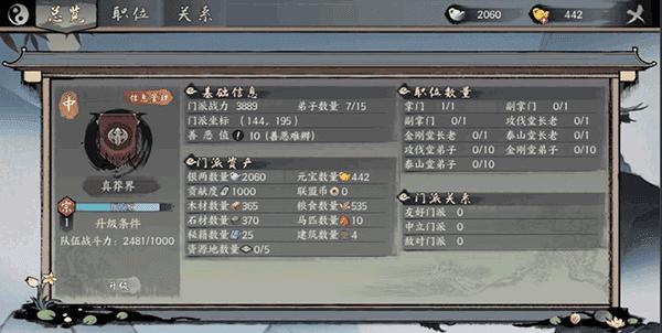 通过点击左上角的宗门纹章,掌门可以看到宗门内的基础信息、职位数量、门派资产以及晋升到灵境名录下一级别门派所需的条件;