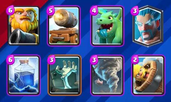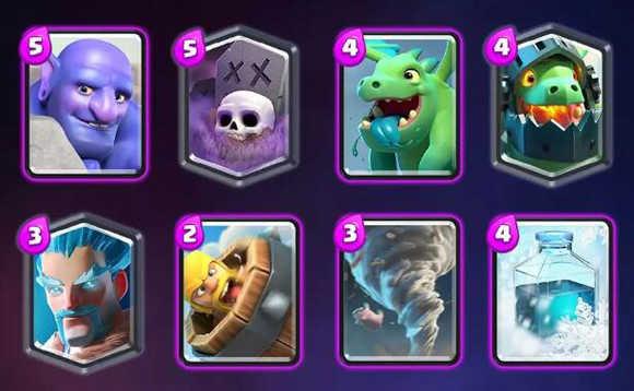 其中骷髅军团哥布林飞桶和火球、野蛮人滚桶、飞龙是必备的,骷髅墓碑和哥布林小屋可以二选其一,猎人可以替换成自己拿手的一张卡牌。