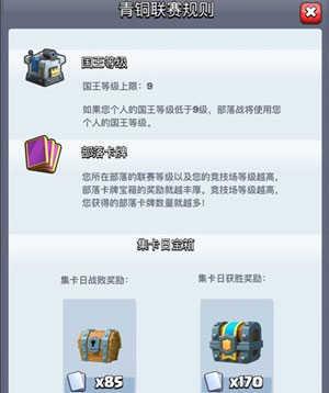 奖励这里就看一下青铜联赛第一名和最后一名的,可以看到奖励多了很多,主要是稀有度方面,金币白卡差不多,橙卡紫卡和出传奇的几率大大提升,哪怕是青铜联赛垫底,都有18橙卡2紫卡,一周对战3.5次的情况下,说真的你的部落很难会全是最后两名,如果你能到第三名,150卡的宝箱,3紫卡30橙卡,已经好过原来的部落宝箱了