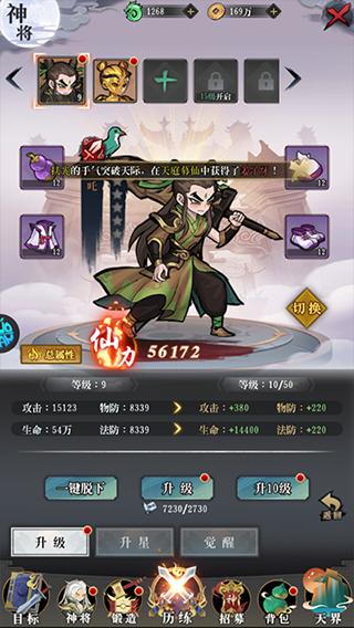 4、选择【神将】,可进行神将的升级、觉醒、升星、布阵、换装等操作