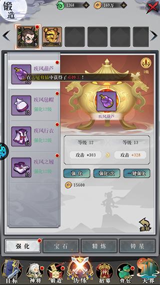 5、选择【锻造】,我们可以对装备、宝物进行强化,提升各方面的属性
