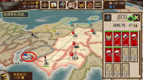 2、这里拿北条举例,开局换好将以后立马进攻武田的武藏,下一回合再回头拿下甲斐,到这里呢差不多开局就算成功了,然后需要做的就很简单了,一直开发自己的领地到满级为止,期间不断炒粮,和周边的势力结盟通商,对方撕毁盟约你下回合马上去结盟,简单说就是不打仗,升级本势力的独有技能就是500块升级一次的那3个技能,都升满,然后攒好兵打斋藤,伊达,上杉,德川从右往左就行了。