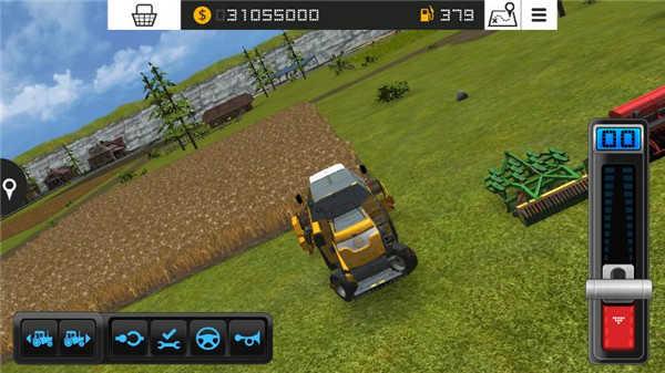 1、首先介绍下游戏的操作,上面一排按钮分别是:商店,可以购买各种拖拉机、运输车、收割机、割穗机、打包工具、中耕机、播种机、化肥播撒机、拖车、割草机、翻晒机、堆行机、转货机、林业等等