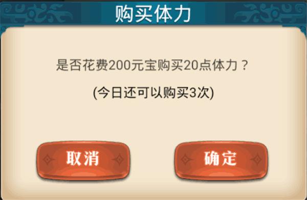 购买体力也是为了扫荡副本,每次购买可以获得20点体力,每点体力可以扫荡一次副本,第2-3次每次需要50元宝,第4-6次每次需要100元宝,第7-10次每次需要200元宝,后面在购买每次需要400元宝。