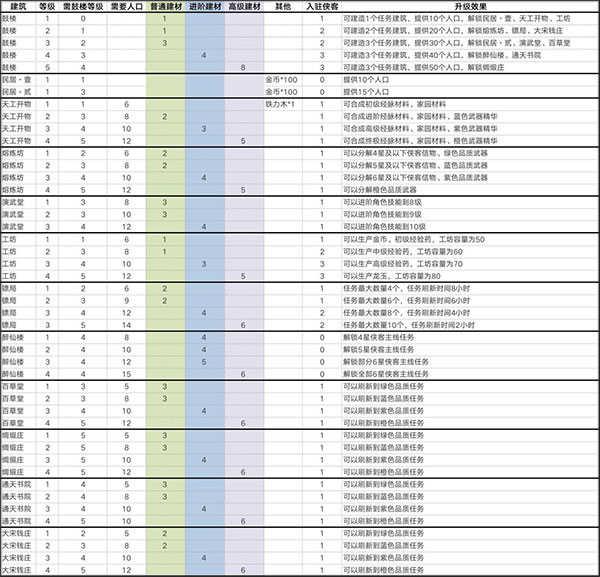 点击建筑,可以选择建筑升级,升级可能会对鼓楼的等级有所要求,具体可以看家园升级表中的需要鼓楼等级。大部分建筑升级会增加消耗的人口,如果家园的总人口不能满足增加的人口,就无法升级建筑。