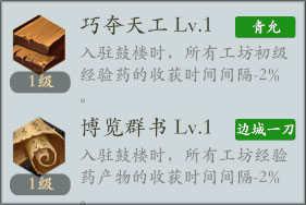 1、解锁家园系统后,立即建造1级鼓楼,1级工坊、1级民居和1级天工开物(合成建筑),因为后期建造其他建筑需要天工开物将低级建造材料合成高级材料。没有侠客经验药加成侠客入驻的工坊都制造金币,当有2个工坊后,一个生产经验药,一个生产金币。