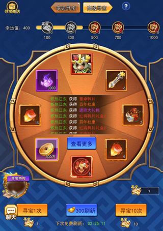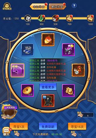 位于主城界面的寻宝系统,主公们可以收集寻宝图进行轮盘抽奖,其内分为幸运寻宝和高级寻宝,有丰厚的道具奖励等着您哦!