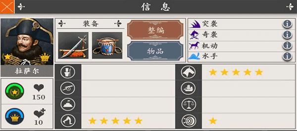 拉萨尔排第六,可能有的朋友会不认同,毕竟拉萨尔曾经也是一代传说呀。但不可否认的是,拉萨尔是一员出色的骑兵将领,他是拿破仑大军的开路先锋。拉萨尔骑兵指挥能力5星,四个技能-“突袭”、“奇袭”、“机动”和“水手”。征服模式中,陆军下水作战是大忌,拉萨尔的水手可以保证其在水中的战斗力。但是欧战的大部分战斗都发生在陆地,“水手”这个技能也因此显得十分鸡肋。