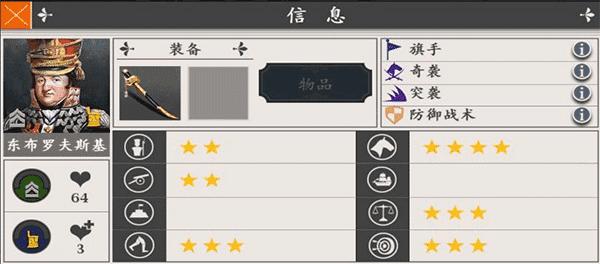 东布罗夫斯基是波兰的骑兵大将,波兰国歌,就是东布罗夫斯基在意大利统率波兰军团时的团歌。东布罗夫斯基的骑兵指挥能力是4星,四个技能-“旗手”、“奇袭”、“突袭”和“防御战术”。旗手这个技能没什么用,或者说作用很小。毕竟将领只有两个装备槽,与其装备把旗帜,还不如装备个武器来得实际。