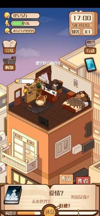 5、立刻完结掉第一本垃圾小说,并把第一个手机游戏小说家模拟玩到通关大概存个几百的灵感,开真正意义上的第一本书,这里前面赚钱学习肯定也拿到了之少一个传奇题材,传奇题材之少有一个搭配能达到7星,所以这时不需要花钱去升级题材,因为这时你其他稀有普通题材升级完最高也不会超过7星,直接拿现有的传奇题材写就好,此时写作能力大概是5星,题材7星,初始大概能有个7.5分,随着后边的能力值提升,第一本小说后边评分达到10分是比较容易的。