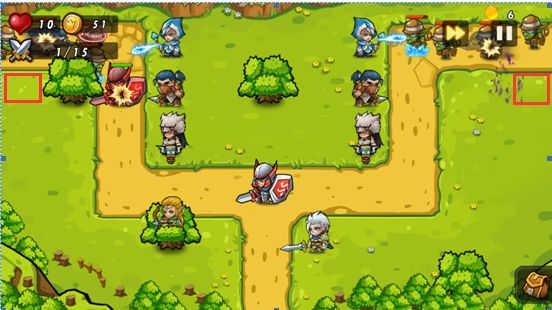 初始阵型:这关布阵需要考虑两侧力量的平衡,我这次因为左侧树的位置比较好,所以在右侧拐角放了英雄,同时为了平衡两侧实力第一个护卫就放在了左侧。其实左右侧的怪都是一样的(红框里有两个小偷,他们飞出去打人了所以没截到)