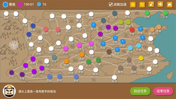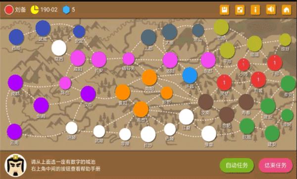 左边第一个图标表示选择了蓝色势力的曹操,第二个图标表示游戏时间190年1月,每年1月系统会投放新武将到城池中。右边从左到右的图标分别是:存档.查看功能.打开帮助手册.开关声音.返回开始界面.关闭窗口。许昌上面的数字4表示城内有4名武将,4上面的灰色小点表示城内还有空闲武将。洛阳上面的数字表示城池有3名武将1名间谍。右下角的蓝色小圈表示城内有我方派去的间谍(这个蓝色小圈好像是多余的,以后的版本可能会去掉)。占领所有城池后游戏胜利,丢失所有城池后游戏失败。自动任务 会在每座城池中挑选合适的武将进行征兵.疗伤.治安.屯田和超度。要注意的是当城池中人口少于2000的时候会抽取武将身上的兵力补充到人口,以保证回合结束后城池有金钱收益。