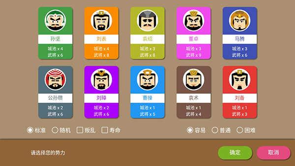 随机:开局时为每个君主随机分配三座城池,5名武将,城池中的金钱粮食均随机。