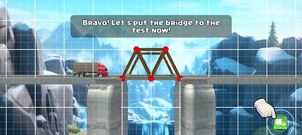 4、最后就是检验桥梁是否合格的时候,桥梁建造完毕之后,点击右下角的行车按钮,货车安全通过,这个关卡就完成了。