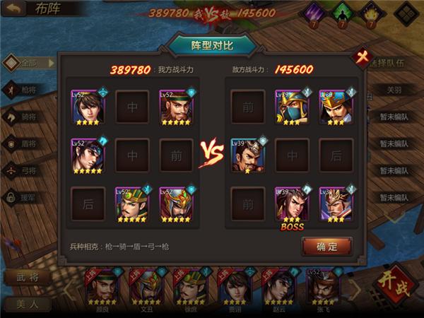 阵型对比是战斗中很重要的一个环节,我们可以看到敌方所派出的武将、站位以及兵种,再根据“兵种相克”的原理组建一支克制敌方阵型的军队,这样我们才有更大的把握获胜!
