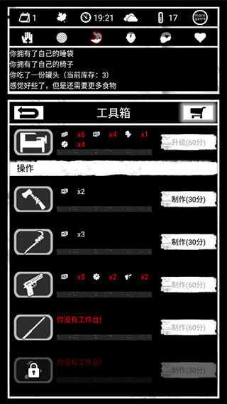 然后是床和升级工具箱,尽快做出鞋子,然后尽快升级工具箱做出背包和防爆衣。