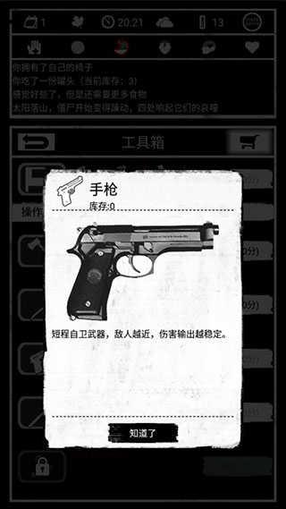 不得不说,除了两种手枪以外,其余的枪以及武士刀,电锯的交换价值是非常高的,但是这类装备破损的随机性非常强,很可能四五次以后就破了,也可能用上十几次二十几次还没破,我对于这些装备的选择很直接,除了手枪,斧头,撬棍,其余通通用来换东西,一方面手枪够用,坏了很容易再造一把,另一方面其它装备比手枪和斧头信价比高不到哪里去,干嘛不随便拿一个来换几十个木材呢?(电锯应该可以换上百个木材)(在子弹足够的情况下自动步枪也可以使用,它的优点是射速快,命中率高,结果是可以无损击杀僵尸,但是耗子弹会比使用手枪要多)。