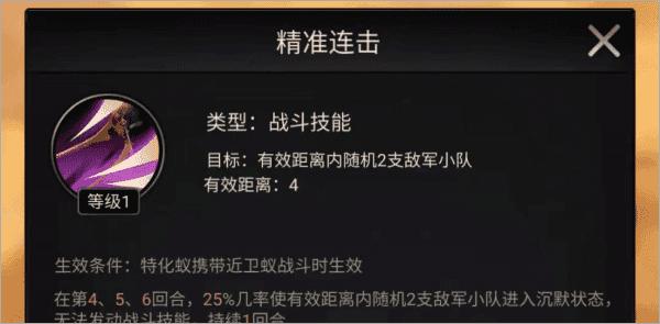 技能目标为有效距离内随机2支敌军小队,也是需要携带近卫蚁战斗时才能生效;初始时,在第4、5、6回合,有25%几率使敌军小队进入沉默状态,无法发动战斗技能,持续1回合;满级之后触发几率提升至70%。