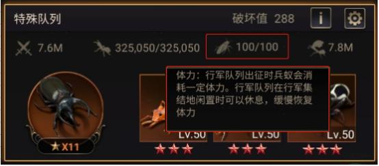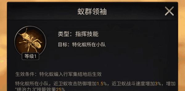 技能目标为特化蚁所在小队,初始时特化蚁所在小队攻击增加1.5%,近卫蚁战斗速度增加3%,并且可以增加【统治力3】技能效果25%;满级之后,攻击增加15%,近卫蚁战斗速度增加30%,【统治力3】技能效果增加250%。