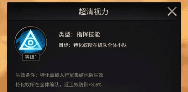 技能目标为特化蚁所在编队全体小队,初始时可使近卫蚁防御增加3.5%,满级之后提升至35%。