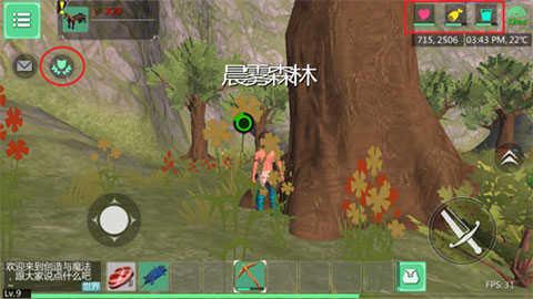 右上角的黄色图标:这个是你的口渴度,当他的长度越来越短时,代表你亟需喝水,不然就会因为太口渴而使生命值降低