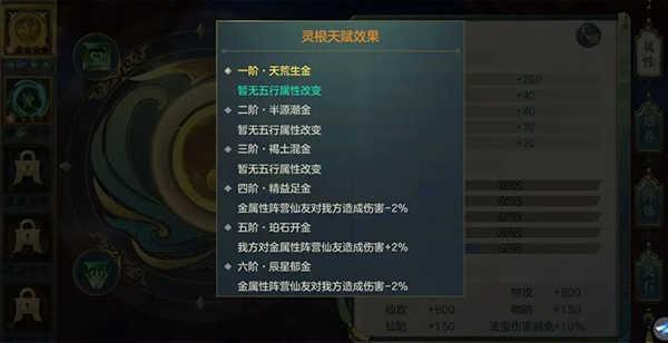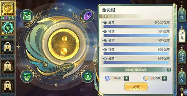 游戏内还有灵根系统,灵根分五种,金木水火土,每一种灵根可以装配四个灵石,四个低级属性的灵石可以合成更高一阶的灵石。