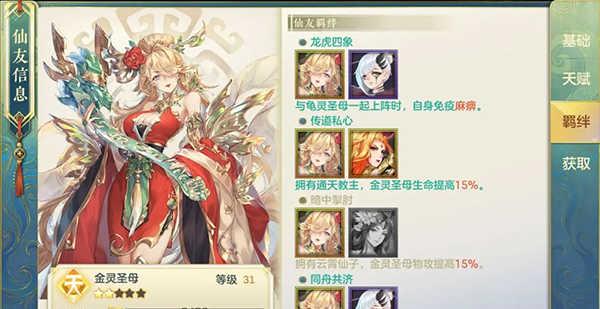 每位仙友一共有五个羁绊效果,其中一个羁绊是需要两位仙友同时上阵触发效果,另外四个羁绊是同时拥有即可触发羁绊效果,因此收集的仙友越多,解锁的羁绊也就越多,提升整体实力也就越强。